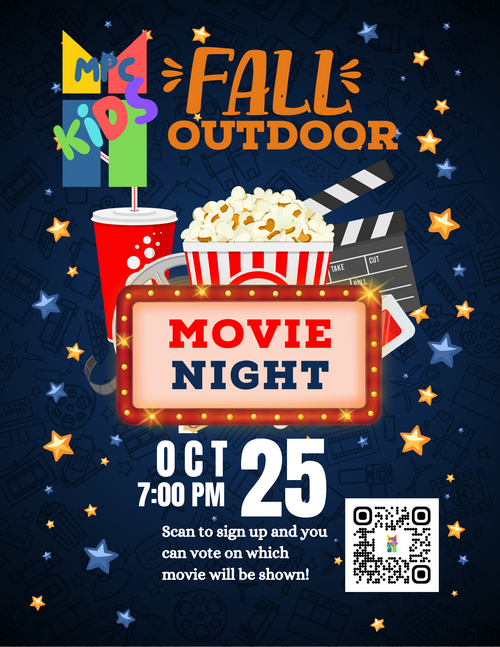 Come join us for a fall evening of fun with your family! Enjoy some hot apple cider, donuts, and an outdoor movie! Please bring lawn chairs, blankets, and warm clothes. Use the link below to sign up. (Bonus: when you sign up you will get to vote on the movie!)